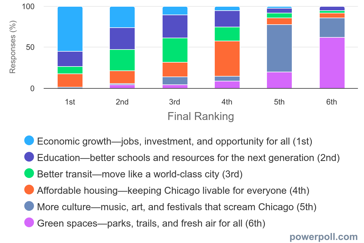 No surprises here. Respondents are focused on the basics: jobs, schools, and getting around. Culture and parks still matter. You can’t have a world-class city if people can’t afford to live or move in it.