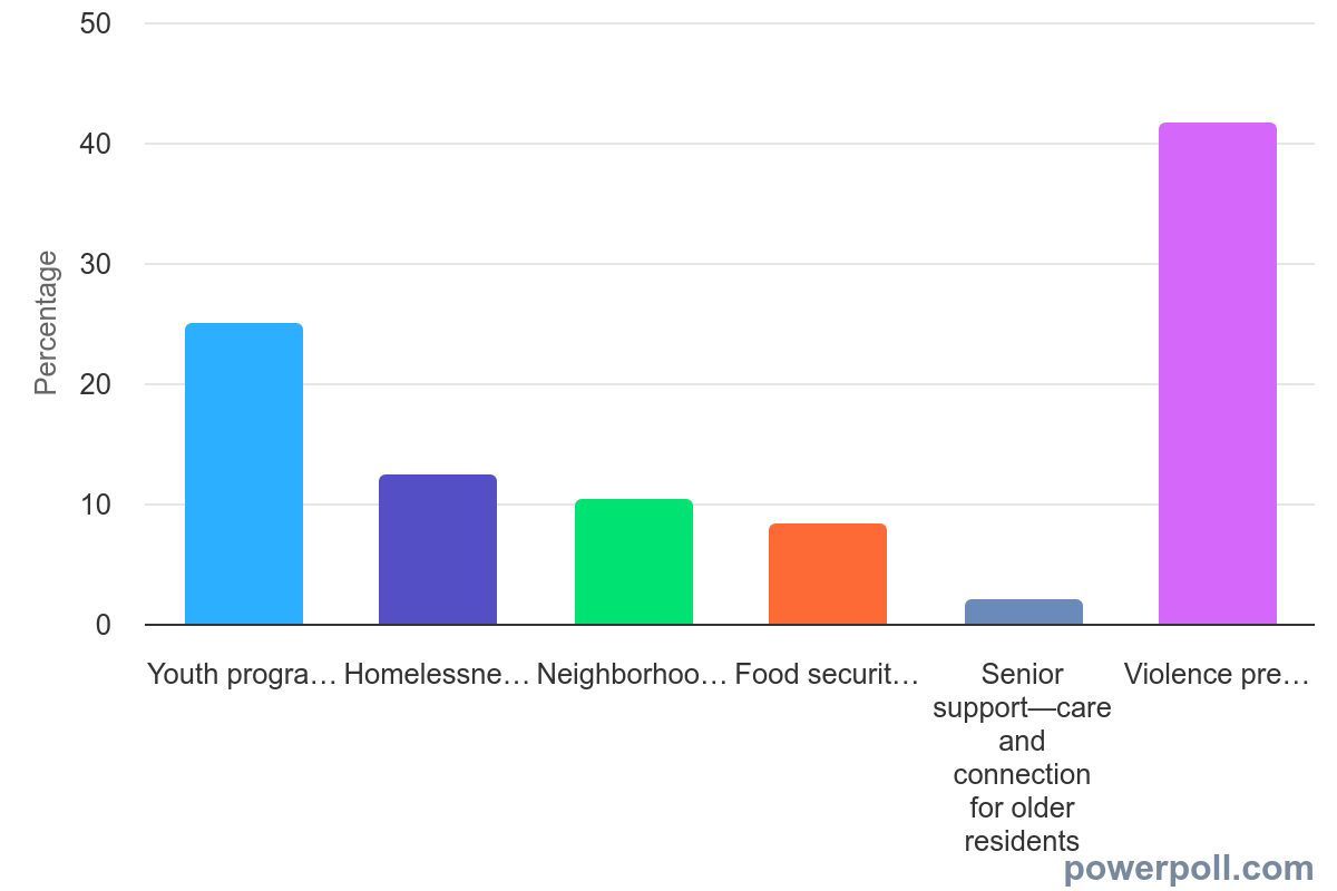 Public safety dominated this question, and the comments made the reasoning clear: nothing else really works if people don’t feel safe. Youth programs came in a strong second, with many respondents noting that prevention and mentorship go hand in hand.