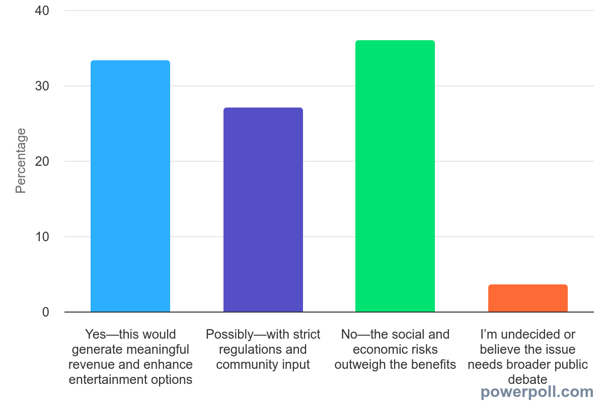 Opinion is divided on legalizing slot machines in Chicago bars and airports to address budget shortfalls. The largest group (36.04%) opposes the idea, citing social and economic risks that outweigh benefits. However, one-third (33.33%) support it as a way to generate meaningful revenue and enhance entertainment options. Another 27.03% could possibly support it with strict regulations and community input, while only 3.6% believe the issue needs broader public debate.