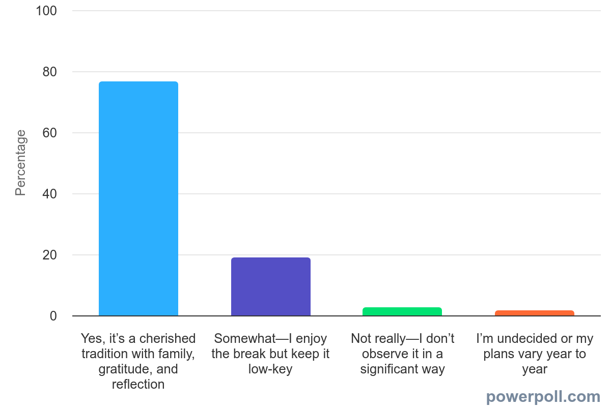 The vast majority of respondents embrace Thanksgiving as a meaningful celebration. Over three-quarters (76.58%) describe it as a cherished tradition with family, gratitude, and reflection. Nearly one-fifth (18.92%) enjoy the break but keep celebrations low-key. Only 2.7% don’t observe it in a significant way, and 1.8% say their plans vary year to year.